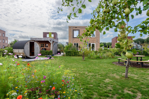 Achterin de tuin bevindt zich een ruime houten berging, voorzien van schuifdeuren en elektra. Ook zijn hier voorbereidingen voor een eventuele laadpaal aanwezig.